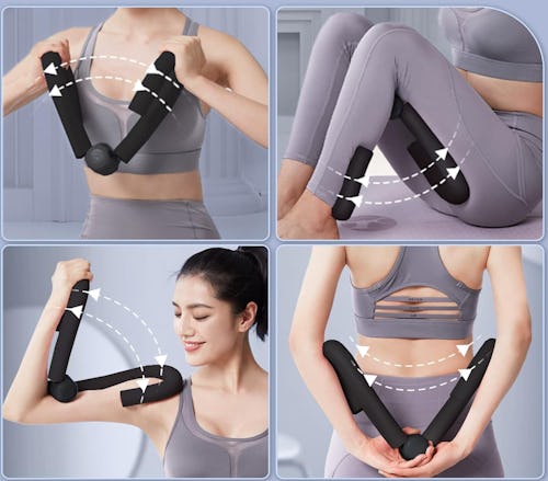 This V-shaped contraption is a super versatile workout and stretching tool. It’s not only a way to aid in deeper leg, arm, and back stretches, but it can also be used to add resistance to your workouts. Put it on your shoulder and upper arm, and curl to fire up your biceps, or around your back to work those triceps.