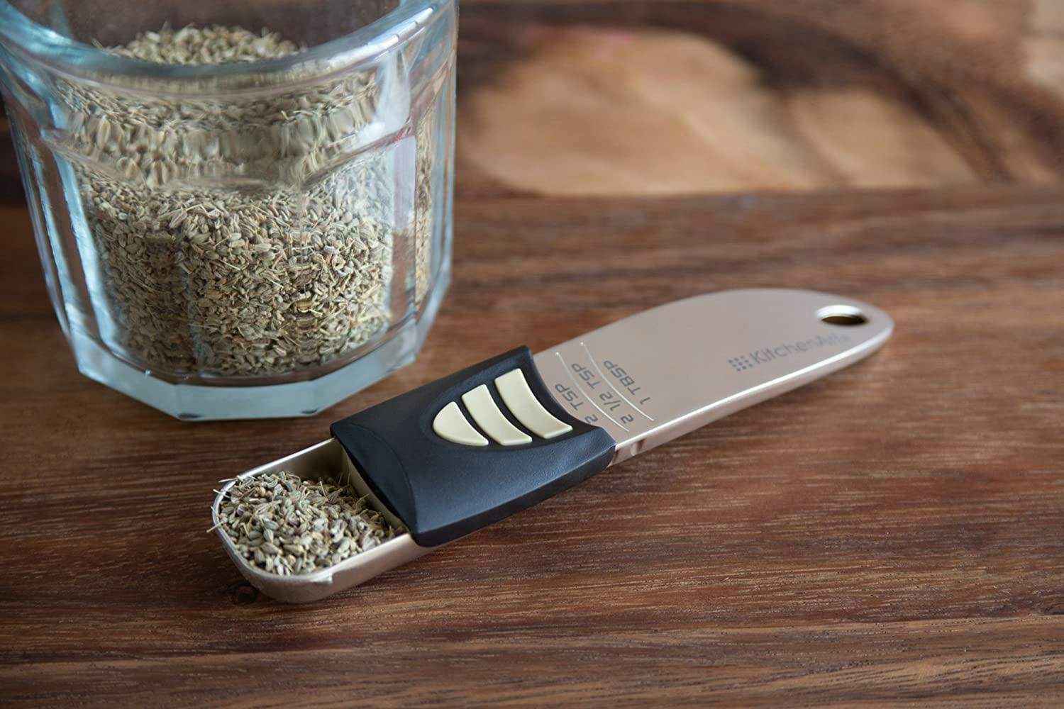 If your kitchen drawers are cramped and overflowing, this adjustable tablespoon can help save you some space. It increases in .5 teaspoon increments from .5 teaspoons up to 1 tablespoon. The champagne satin finish is a nice touch, and it's made from a durable blend of zinc and alloy.