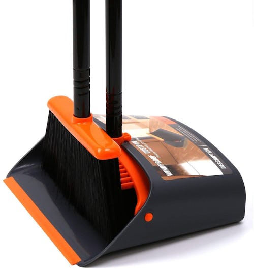 This upright broom and dustpan set save space while providing an easy way to tidy up your floors. The standing dustpan and long-handle broom allow you to clean without bending over, working effortlessly on tile, wood, and laminate. A scraper built into the pan helps remove pet hair — and human hair — from the broom. Just snap the broom and pan together after using for compact storage.