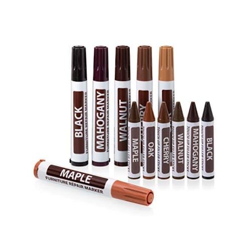 Repair nicks, scratches, and dings with this furniture retouching set. It comes with a collection of markers and wax sticks that quickly cover imperfections. Offered the shades of cherry, mahogany, walnut, black, maple, and oak, they're perfect for any patch job.