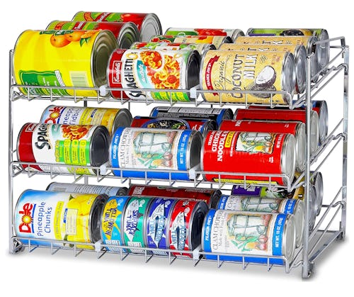 A stackable can organizer that holds up to 36 jars & cans