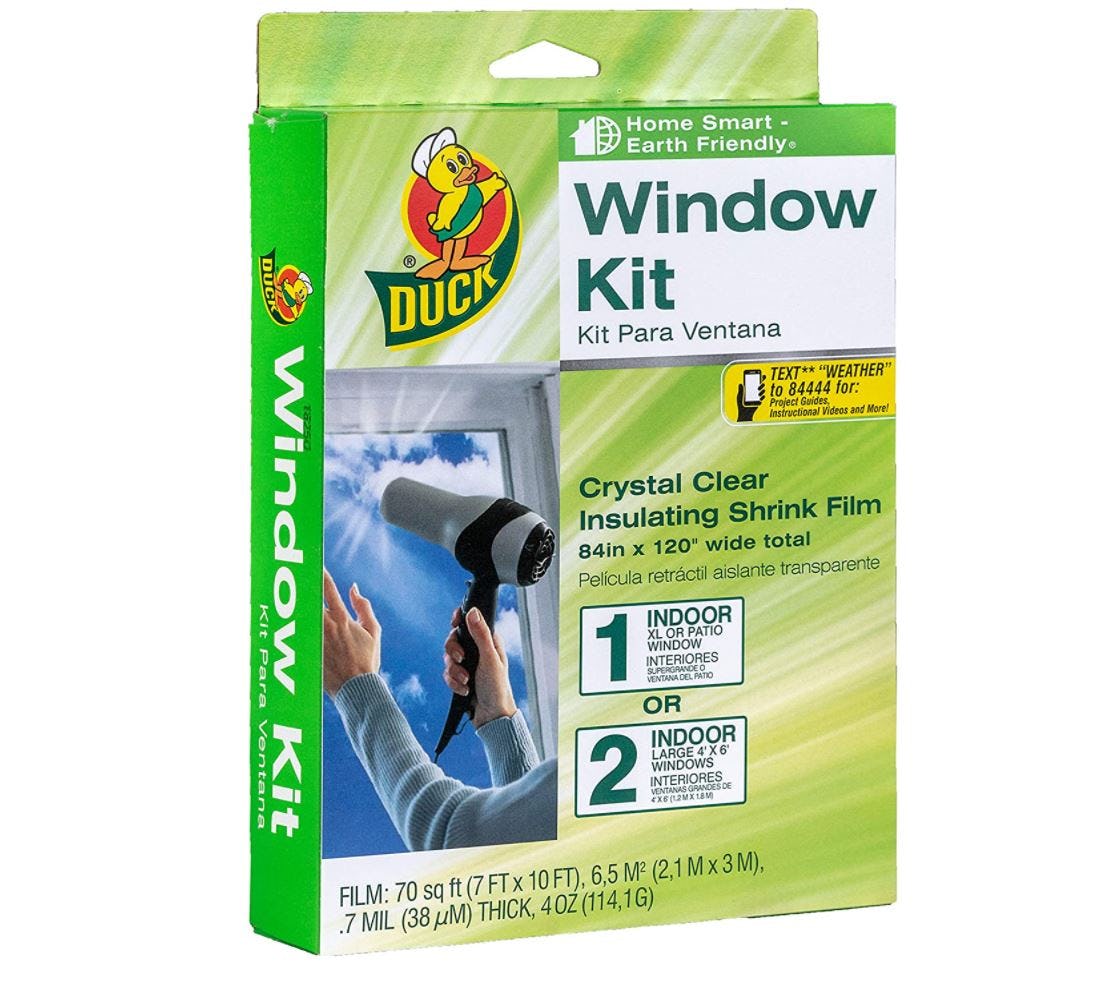 This window wrap is a tried-and-true, inexpensive solution for making older windows more efficient. You wrap the entire window, sticking the film to the frame with the peel-and-stick tape. Then shrink it with a hairdryer so that the wrap is snug and nearly invisible. That pocket of air between the wrap and the glass becomes insulation and it’s quite effective at keeping heat inside (and cold out).