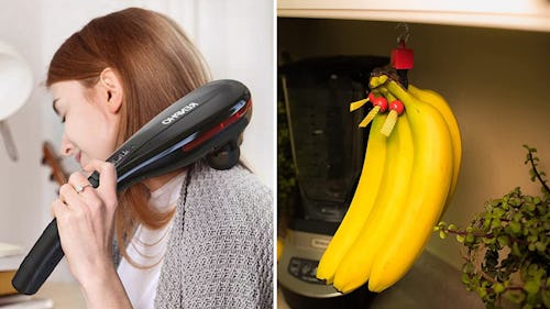 This bungee device is a must have if you keep a lot of bananas in your house. Here's how it works: Just screw this device into the bottom of a kitchen cabinet, then pull the stretchy cords between the individual bananas. This device will hold your bananas slightly separated and off the countertop to prevent them from bruising.