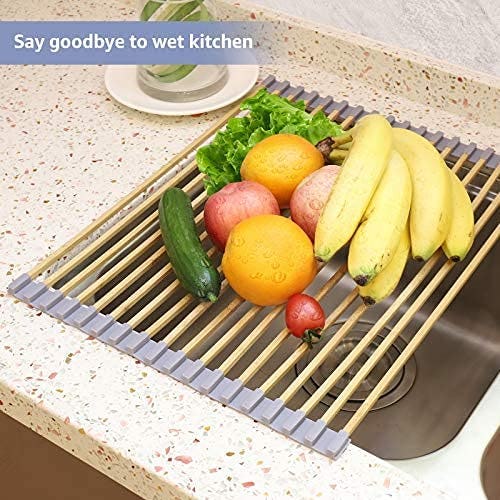 You won't take up an inch of counter space with this bamboo drying rack. It rolls out right over your sink basin so you can set freshly washed produce or dishes on top. The moisture drips off into the sink instead of on your counter or a tray you have to empty, and the lightweight bamboo rods dry quickly. And even though this rack looks delicate, it can support up to 24 pounds of weight with ease.