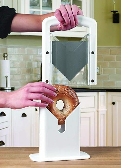 One reviewer writes that this bagel slicer is a "great little unit and very well made." The super sharp blade slices cleanly through any bagel in seconds, and the plastic base holds the bagel carefully in place to keep it from slipping. You can also separate the parts and wash them in the dishwasher.