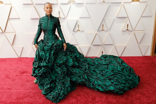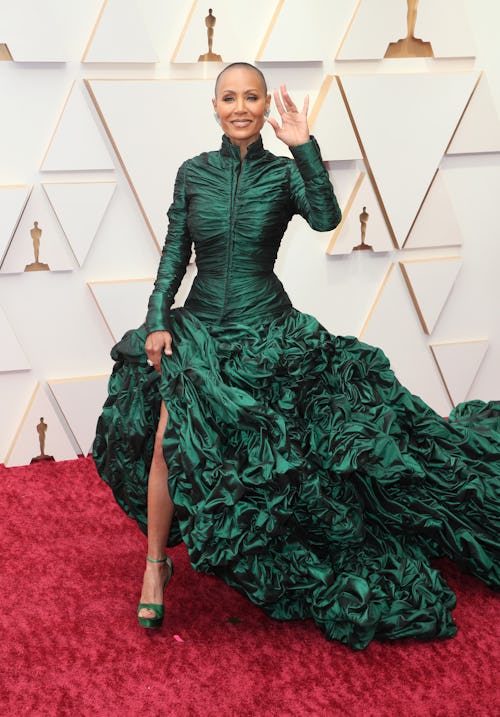 Jada Pinkett Smith stunned in a green Jean Paul Gautier Couture gown and Jimmy Choo heels, looking regal on the red carpet. A train of ruffles, ruched fit, and elongated collar made her seem larger than life — and it’d take more to knock her down than a Chris Rock joke.