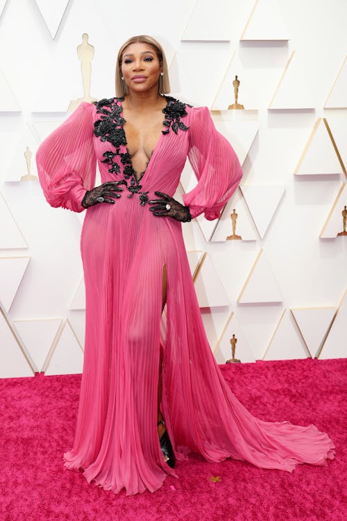 Serena Williams channeled a romantic look in her pleated Gucci dress. While its silhouette is classic — nearly bordering on simple — lacy black floral details, lace trim, and matching black lace gloves elevate the outfit to the campy ‘70s style that has recently become synonymous with Gucci. Rings underneath the gloves add even more glamor to the look.