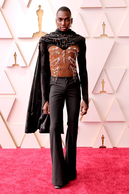 Rickey Thompson did away with ordinary Oscars menswear, and we’re glad he did. The social media star looked breathtaking in an embellished velvet look from Italian streetwear label GCDS — short for God Can’t Destroy Streetwear — which featured cascading gemstones reminiscent of blood dripping off bones. The bottom half of the look, a high-waisted flare pant, was also a much-needed (and welcomed) silhouette on the red carpet.