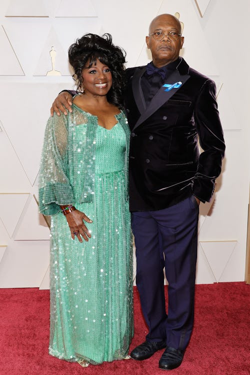 Velvet suiting is hot this season: Jason Sudeikis, Andrew Garfield, Chris Evans, and Jason Momoa have all worn the look on the red carpet recently. Although their tuxes included pops of color, Samuel L. Jackson’s kept it simple, allowing his jacket’s black velvet to contrast its satin-looking buttons and collar. The actor completed his handsome look with a blue ribbon to show support for Ukrainian refugees.
