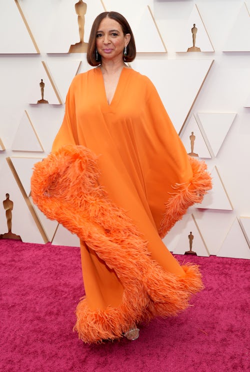 Zendaya’s red carpet look from Valentino Haute Couture channeled a sense of opulence with a satiny cropped button-up, sparkling skirt, and heavy jewelry. It was her after party outfit, however, that truly stole the show: Power shoulders, an elongated jacket, a pop of purple, and a brooch gave the actress a compelling and refined ‘70s vibe. Her slicked hair only furthered the authoritative look.