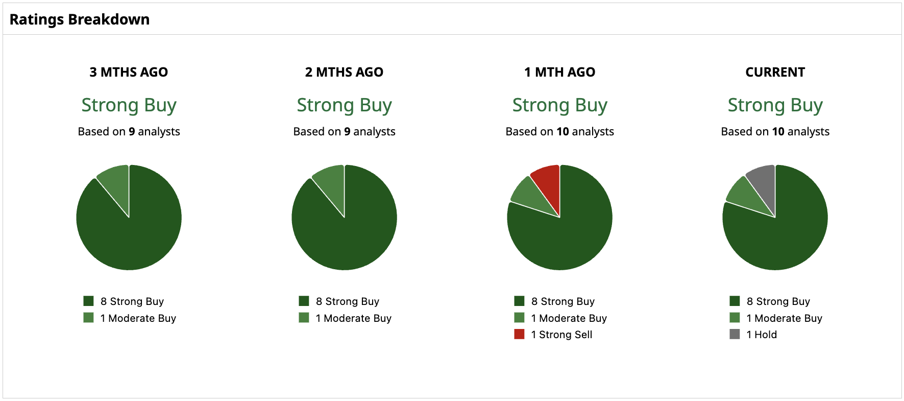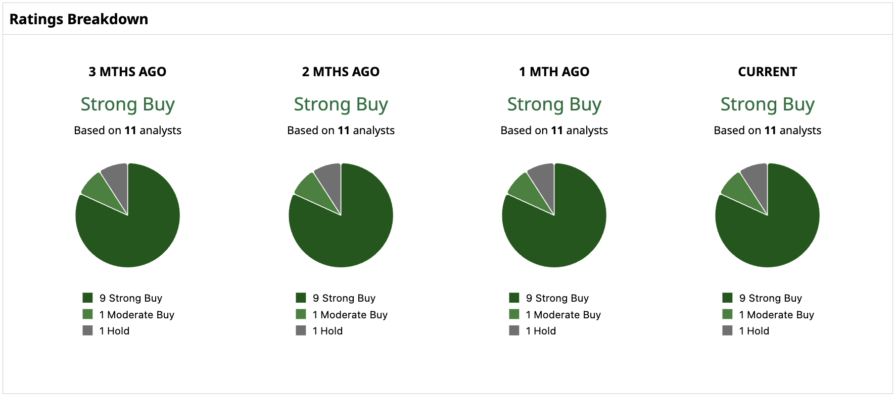 Out of 11 analysts, nine rate it a “Strong Buy.”