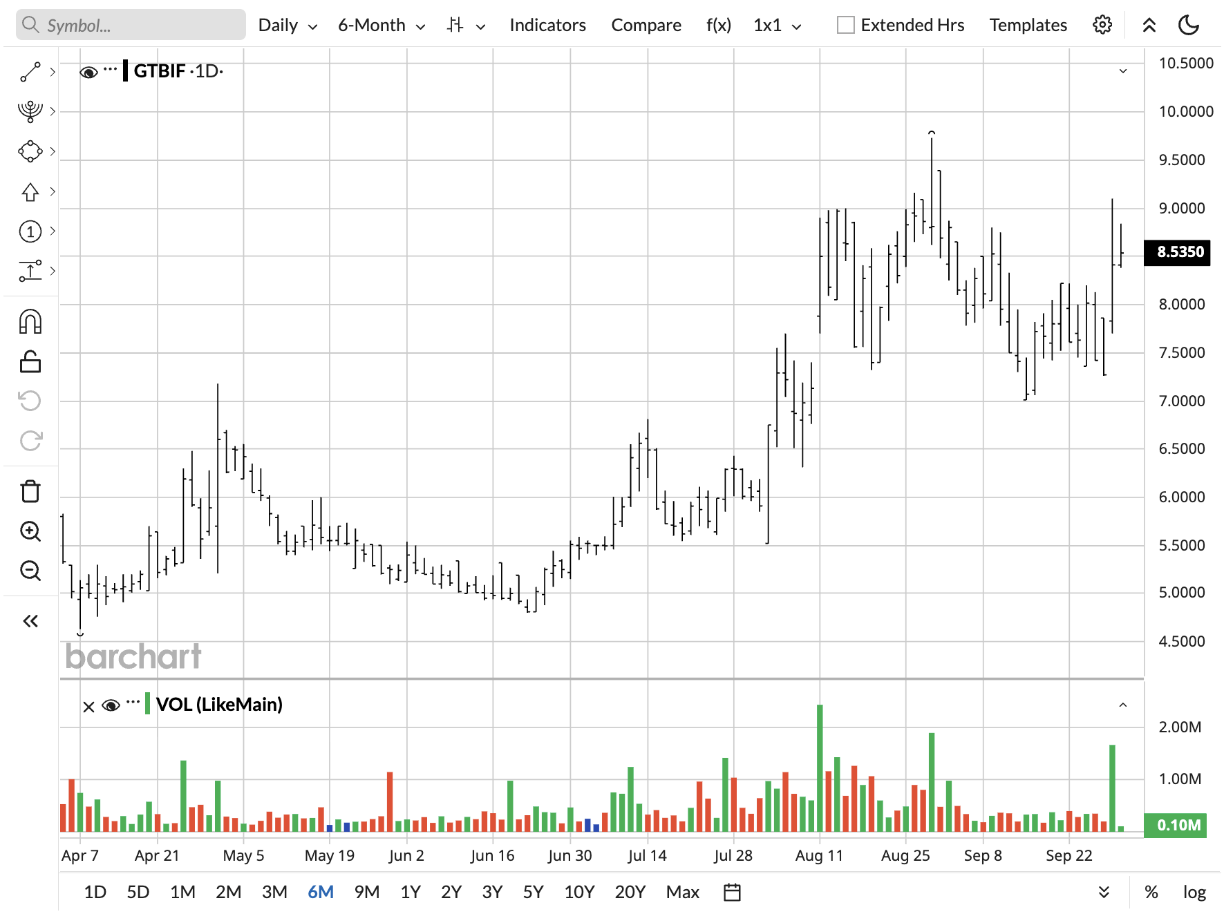 GTBIF stock rose almost 19% from its Friday close to its peak this Monday. Like most other cannabis stocks, traders here are awaiting more clarity, and the stock has been trading sideways. It has a consensus “Strong Buy” rating.