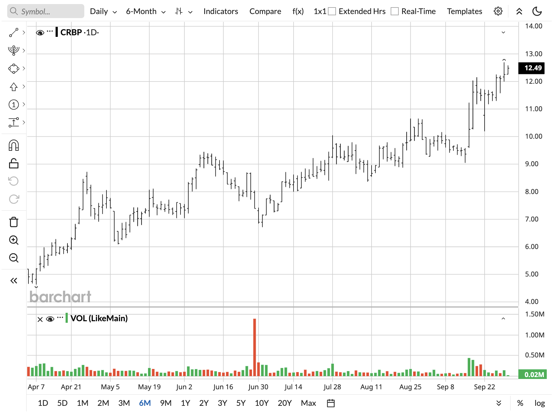 As a result, this indirect connection to cannabis did lead to a small uptick. However, this is a part of a larger rebound, as CRBP stock is up 129% in the past six months.