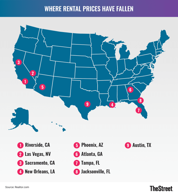 According to Realtor.com's monthly rental report, the city with the steepest drop in monthly rental prices was Riverside, California. In November 2022, the rent price for an average of apartments ranging from a studio to a two-bedroom was $2,071 -- a 5.5% drop from the year before.