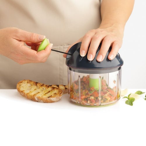 Because the Kuhn Rikon Swiss Chop Chop doesn't require any batteries, plugs, or power sources, you can use it absolutely anywhere to prep your ingredients. The stainless steel blade turns with every pull of the manual cord, so you can coarsely chop ingredients or keep going until they're finely cut. The bottom has a non-slip grip, and all the parts save the lid are dishwasher-safe.