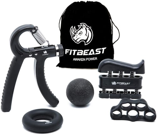 This grip strengthener is part of a five-pack of tools that all improve strength, power, and speed in your wrists, fingers, and forearms. The strengthener and the finger exerciser are both made with stainless steel parts that will last through many workouts. Also included is a resistance band that improves joint flexibility, a ring grip exerciser, and a stress ball. The set is great for everyday use or for injury rehabilitation.