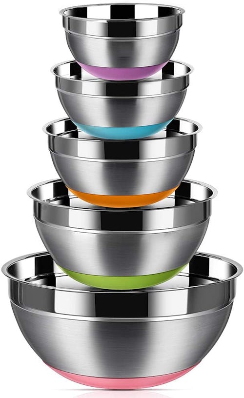 What’s especially great about these stainless steel mixing bowls is that each one is designed with a nonslip silicone bottom — this way, you don’t have to worry about a bowl sliding or spilling while you stir. You get five different sizes in a set, perfect for a wide variety of cooking projects. When you’re not using them, they nest for convenient storage.
