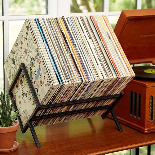 Put your super retro records on display with this slanted metal vinyl holder that's just really neat. Ready to order in true black and gold, this easy-to-assemble stand can hold up to 100 records so you're pretty much set. The cherry on top is the silicone padding at the bottom of each leg that makes this essential scratch-proof. You’re welcome.