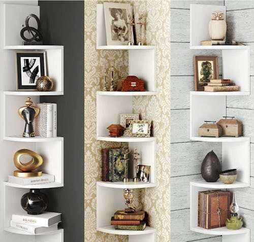 You can display your picture frames on top of a dresser, or you can implement some newfound design skills with this five-tier shelf set. These shelves are made to fit cozily into corners and are ultra-durable so they can hold up to 11 pounds of your photos, plants, and latest reads. They also come in a wide range of colors from rich espresso to rustic blue, so you can match them to your room's color palette. So many options.