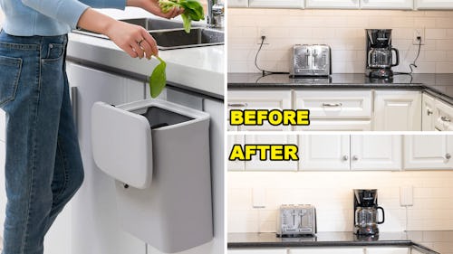 This little trash can with a lid will keep your countertop looking way tidier than it usually does during dinner prep because you can easily sweep butter wrappers and veggie scraps right into it. You simply hang it over a cabinet, so you can quickly tuck it away after dinner cleanup if you want to. It also comes with an adhesive hook if you want to permanently attach it to your kitchen island.