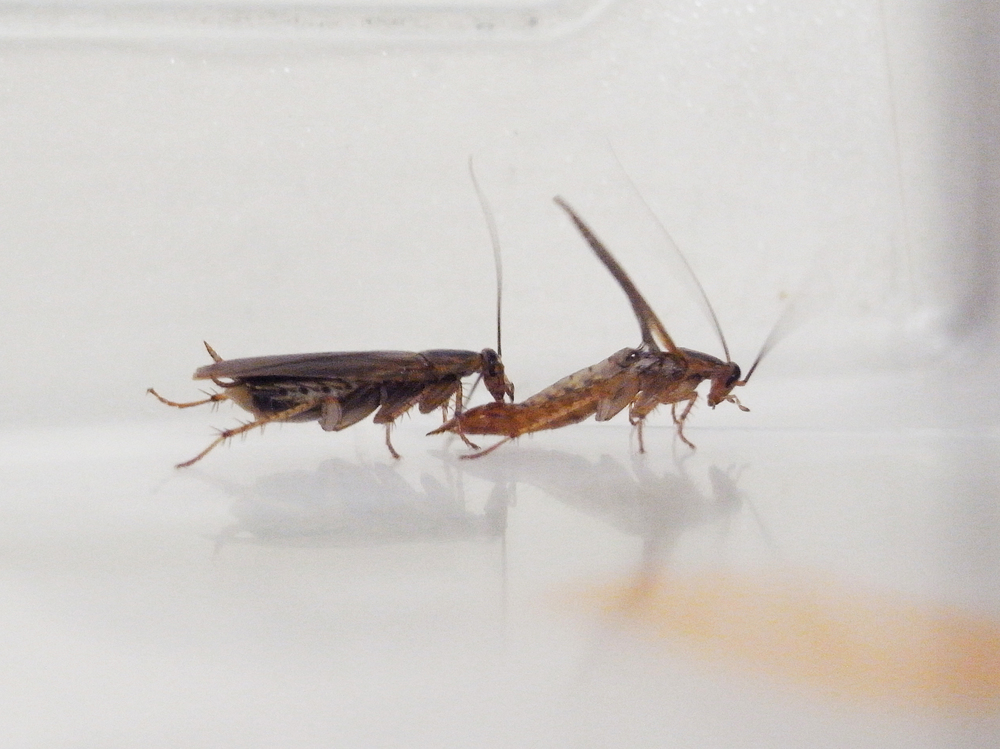 In his lab, he deposits a female German cockroach in a dish. After a few minutes, he adds another roach.