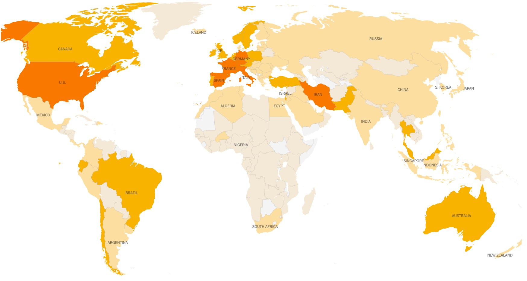 One of the most striking things about the NYT's global map is the realization that there is almost no country on earth that's entirely coronavirus-free. The few that are — like Zimbabwe and Lesotho — almost definitely have cases they simply don't yet know about due to a lack of active testing. We'll be very surprised if anywhere aside from the most lightly populated and isolated regions (like small islands) remain unscathed by the pandemic. Github is also collecting and collating the NYT's data and making it available to anyone who wants it.