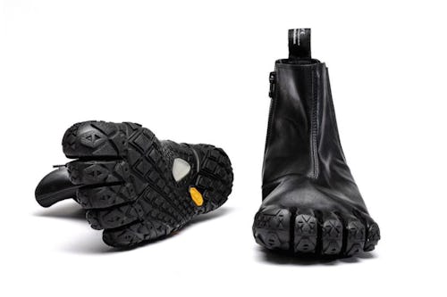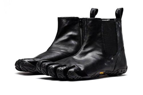 The introduction of the FiveFinger Chelsea boot only keeps us further on our toes (or perhaps, curls your own digits in disgust). Up top, the shoe is surprisingly luxe, done up in glossy black vegan leather. Elasticated side panels and a zipper help ease the process of slipping your foot in and out of the boot. That’s probably a good thing, too, the vegan leather will probably leave your dogs sweating severely.