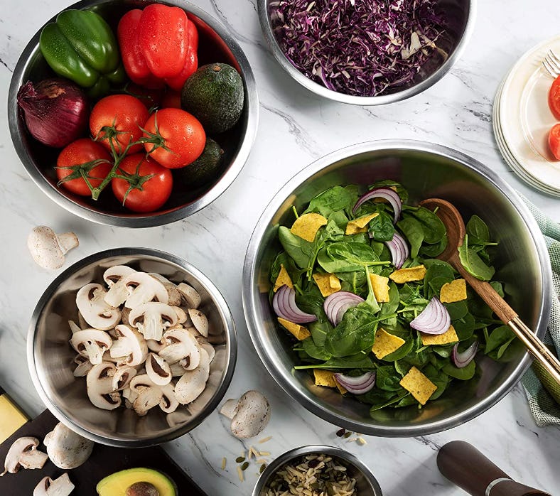 Made of durable and lightweight food-grade stainless steel, this set of mixing bowls is odor-resistant and freezer and dishwasher-safe. Comfortably nesting inside each other to save space, they come in six different sizes, so whether you’re prepping, mixing, tossing, or stirring, there is a bowl for every task.