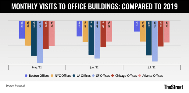 But compared to 2019, they are still down 65.8% in San Francisco, 56% in Los Angeles, 41.6% in Chicago, 35.2% in Atlanta and 33.7% in New York.