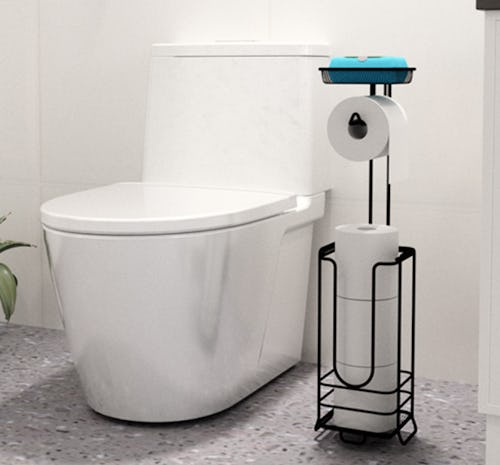 Unlike other toilet paper holders, this toilet paper stand doesn’t require drilling or a complicated installation process. It can hold four rolls at once so you won’t have to worry about running low while you’re using the bathroom and features a sturdy base with four feet that prevent it from tipping over. It’s designed with a shelf at the top that can be used for wipes, your cellphone, or other small items.