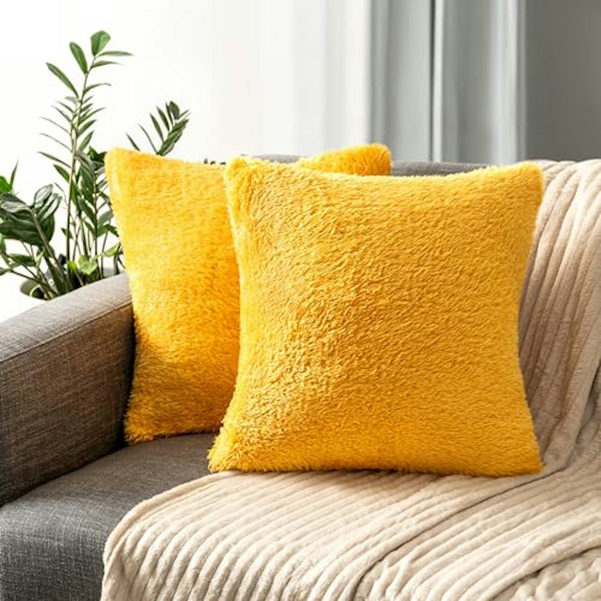 PAVILIA Fluffy Mustard Yellow Throw Pillow Covers, Decorative Accent Pillow Cases for Bed Sofa Couch, Soft Faux Fur Cushion Cover, Square Sherpa Pillowcases, Home Room Decor, Yellow, 20x20 Set of 2