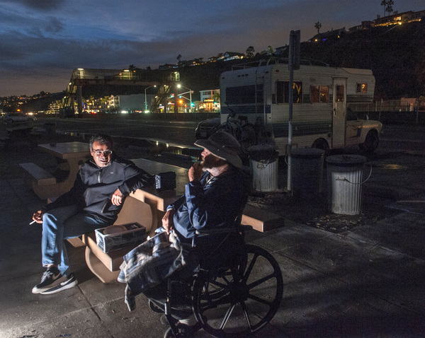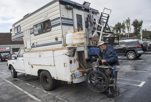 In 2012, he said, he broke part of his spine twisting to lift a heavy load at a recycling facility. Unable to pay rent, he bought a mattress from a thrift store, a two-burner stove and an ice chest and camped in his work truck by day at Baby Beach in the harbor and by night on the streets of Dana Point.