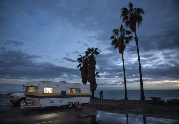 The friends _ who initially bonded over their love of the guitar _ are among about 40 regulars who sustain an enduring and growing homeless beachfront encampment on wheels: a scattering of well-traveled RVs and cars spread throughout several parking lots. They spend their days and evenings immersed in panoramic views, steps from the surfline.