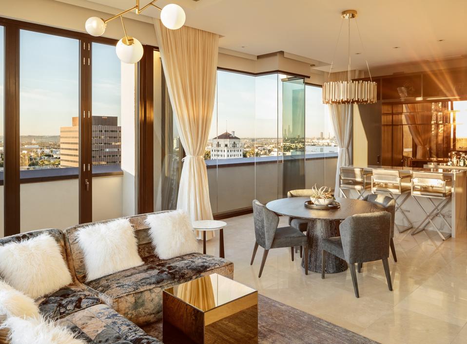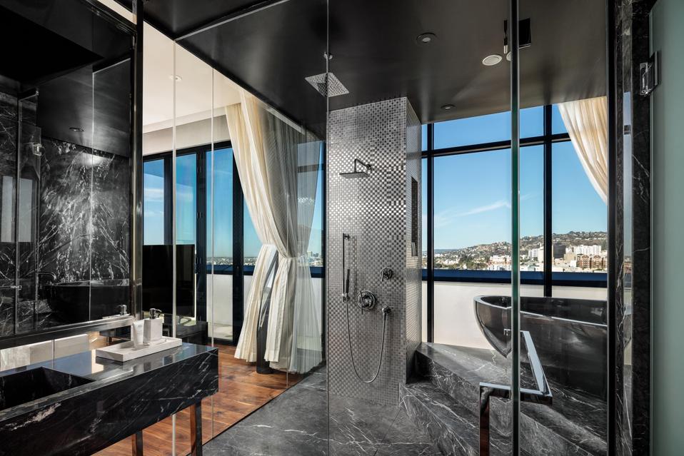 The opulent, 1,750-square-foot Guest House Presidential Suite is perfect for couples looking for a romantic getaway. They can snuggle up in the plush, velvet upholstered platform bed or enjoy the glass-encased soaking tub to take in the sweeping views of Los Angeles. Movie-loving couples will also enjoy the living room, which transforms into a private screening room replete with a Sonos sound system throughout the room. The suite also features a private terrace, in-room iPad, full-size closet and rain shower to provide the ultimate, luxurious retreat for couples.
