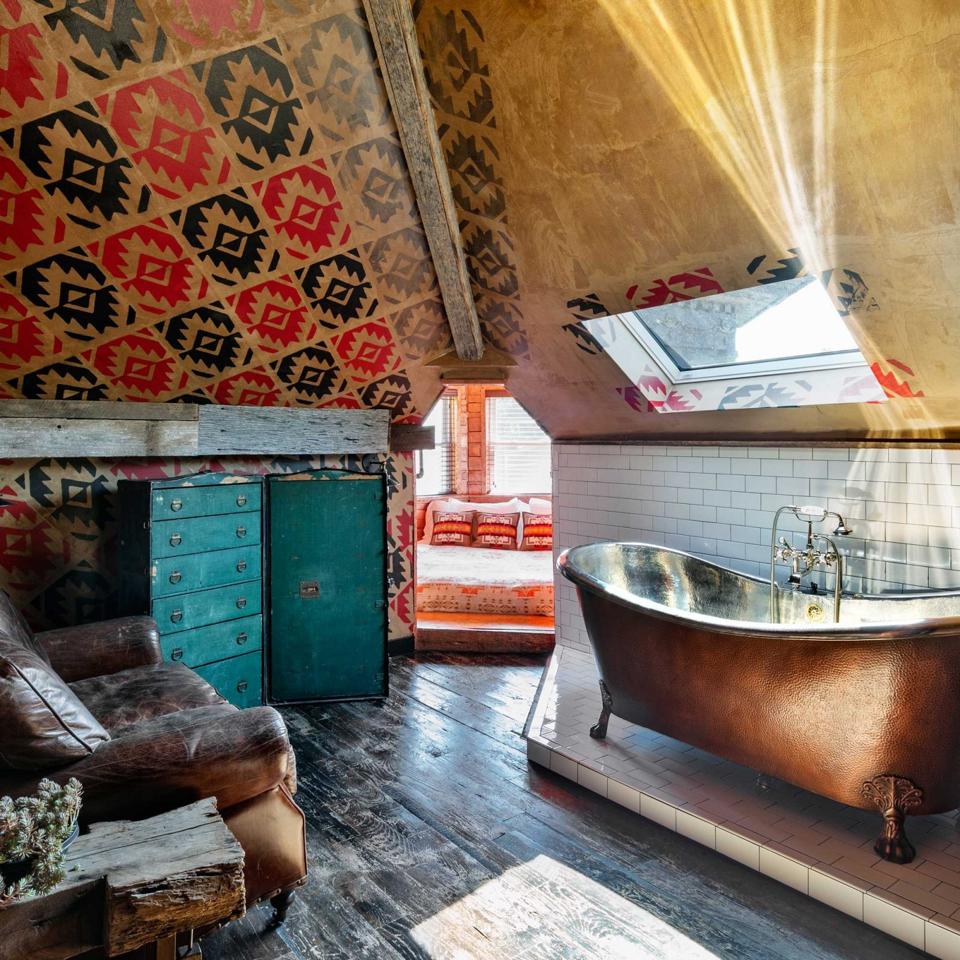 Located in the cultural epicenter of East Nashville, Urban Cowboy’s eight experiential suites are housed in a historic Victorian mansion. Couples can enjoy oysters and stay over in the Tower Suite, a Copper Leafed Oasis that transports one to another world. Relax in a Copper Tub with a Nickel Slipper, pitched 14-foot ceilings, ensuite bathroom and custom blanket wallpaper.