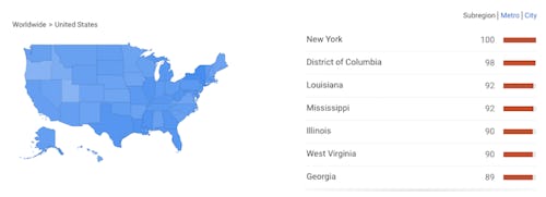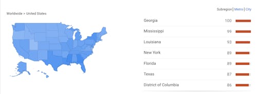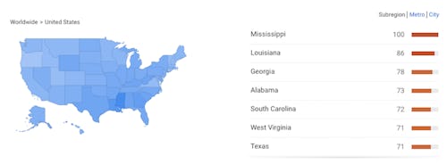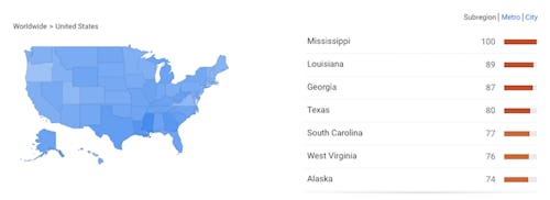 These search concentrations correlate, in part, with poverty levels: Louisiana and Mississippi have some of the highest poverty rates in the country, and Georgia is among the 10 poorest states. Some research demonstrates a link between poverty and young people using contraceptives less, and other studies have revealed poverty correlates with a deficit in youths' sexual health knowledge.