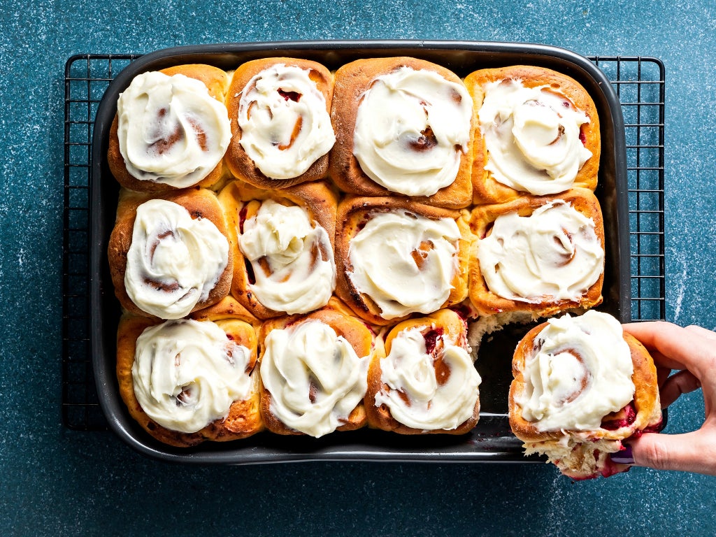 Fluffy and tart-sweet, these swirly cranberry rolls get topped with a tangy cream cheese frosting after they come out of the oven. A tray of 12 makes a cosy breakfast or brunch on cold mornings.