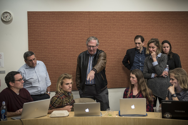 Zvika Krieger, center, an instructor of Hacking 4 Diplomacy at Stanford University, speaks to students during one of the final classes of the semester.