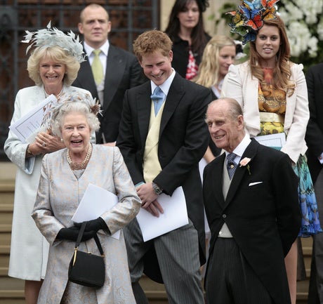 Photograph: Members of Britains royal family leave the St George's Chapel in Windsor after attending the marriage ceromany of Mr Peter Phillips and Miss Autumn Kelly (PA)