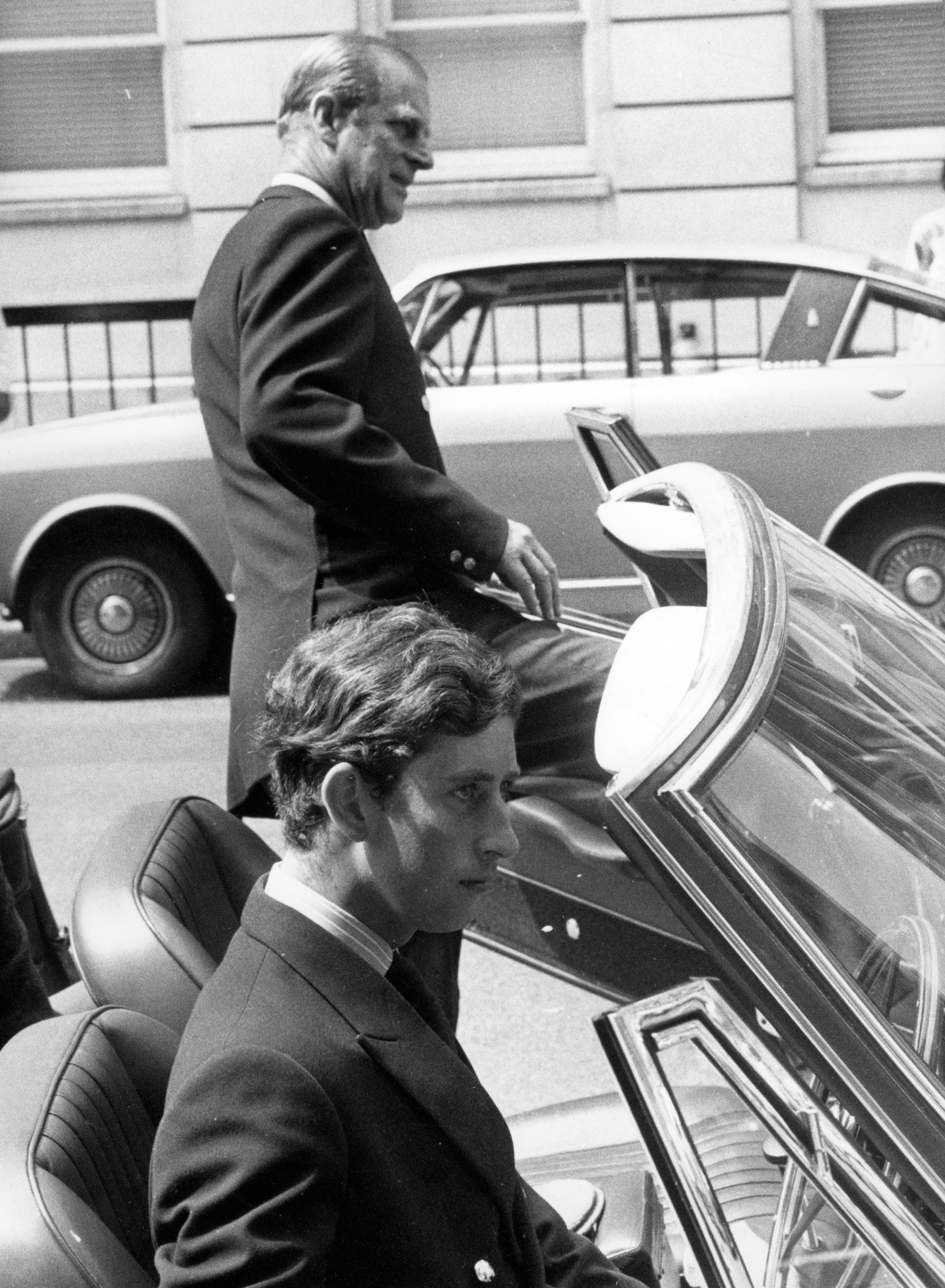 The Duke of Edinburgh about to get into an Austin Martin car, driven by the Prince of Wales, outside King Edward VII Hospital for Officers in Beaumont Street, London (PA)