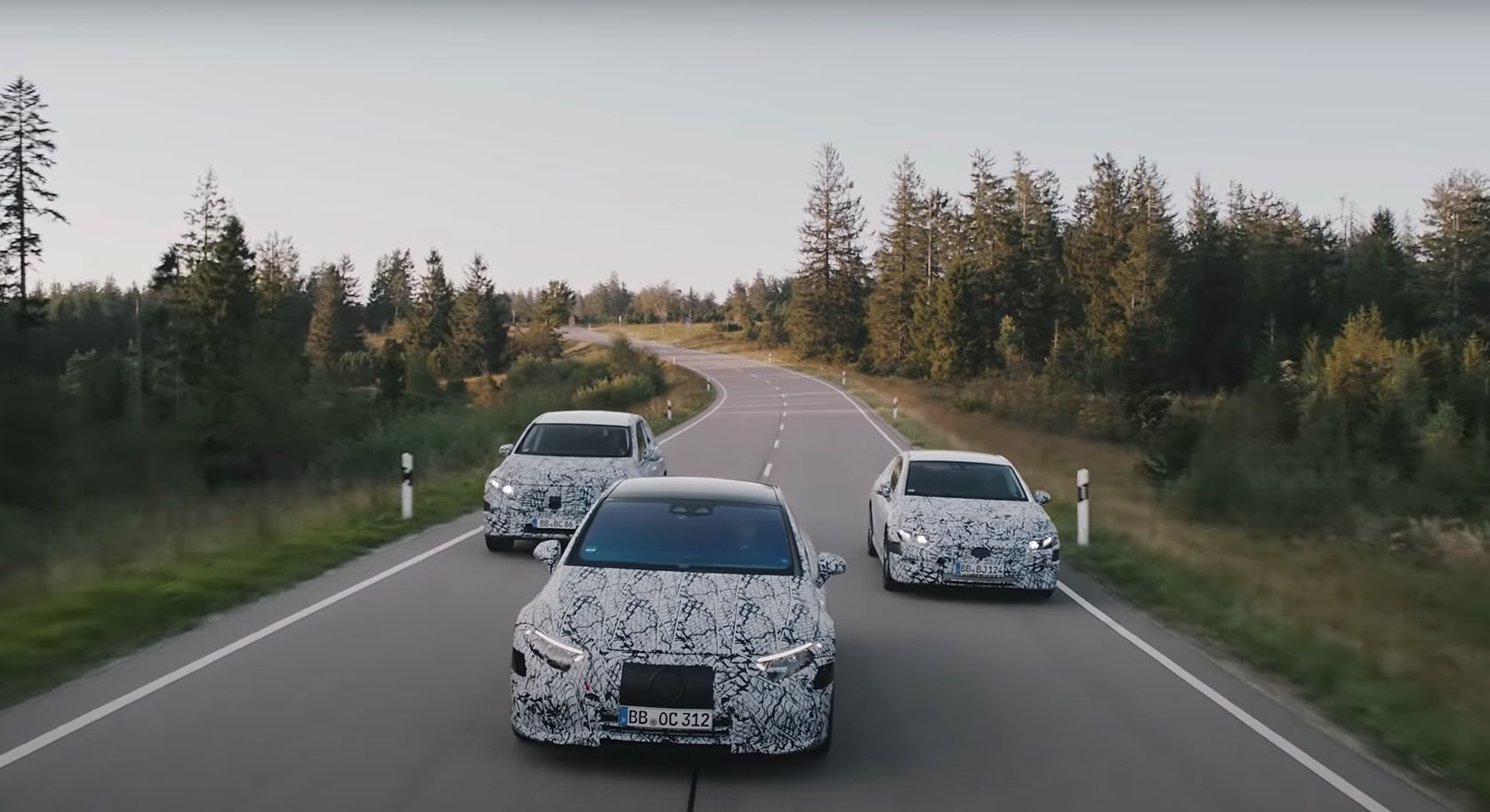 In a short clip posted to YouTube — that's heavy on fast cuts but light on detail — Mercedes Benz introduces two sedans (the EQS and EQE) and an SUV (the EQS SUV) all speeding down empty roads in the Black Forest and all clad in contemporary dazzle patterns to make it harder to discern their details. We can be sure of a few things, though. The vehicles start arriving on showroom floors and streets next year, they're going to be expensive and luxurious, and they want to eat at least a bit of Tesla's lunch.