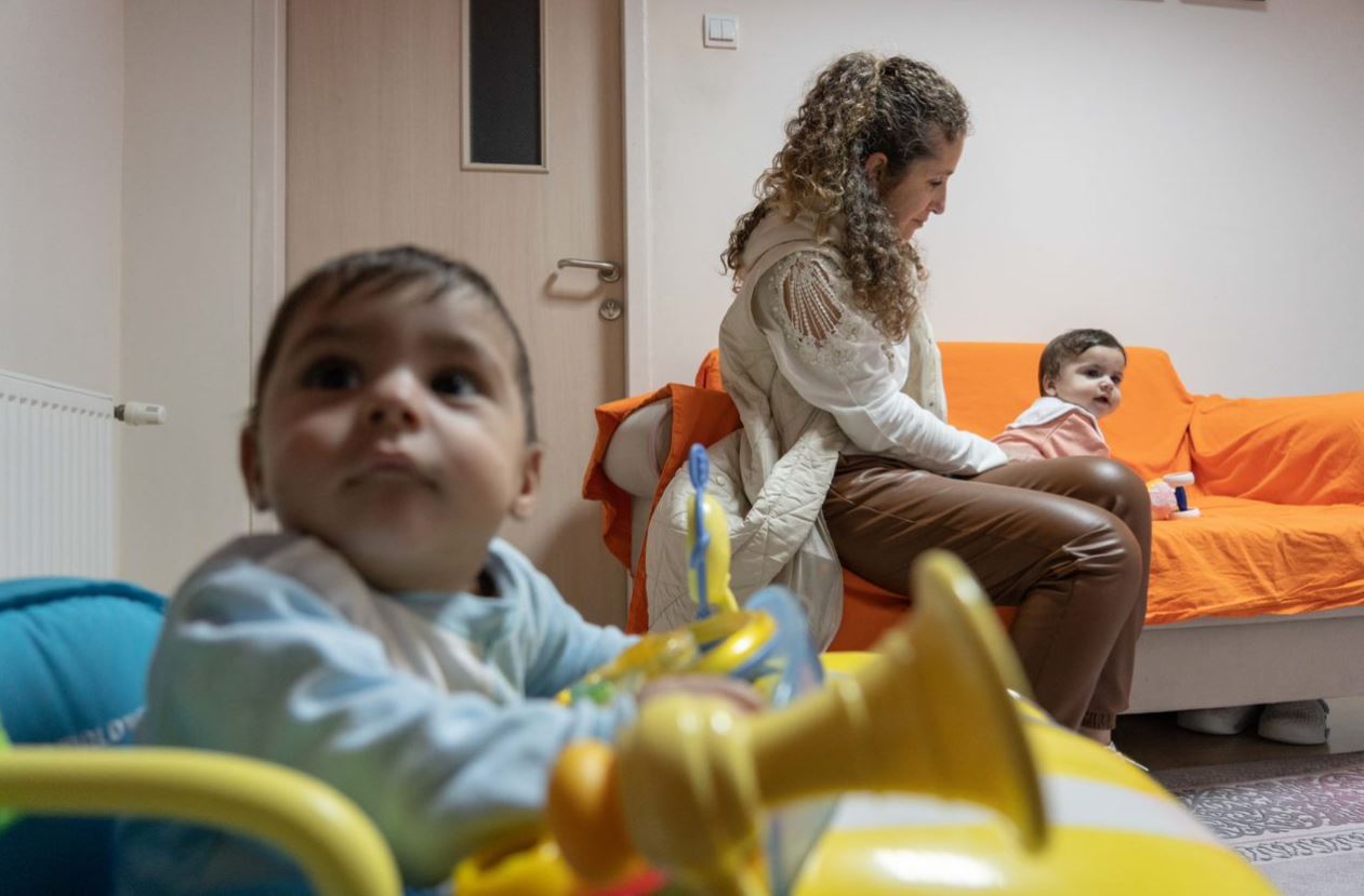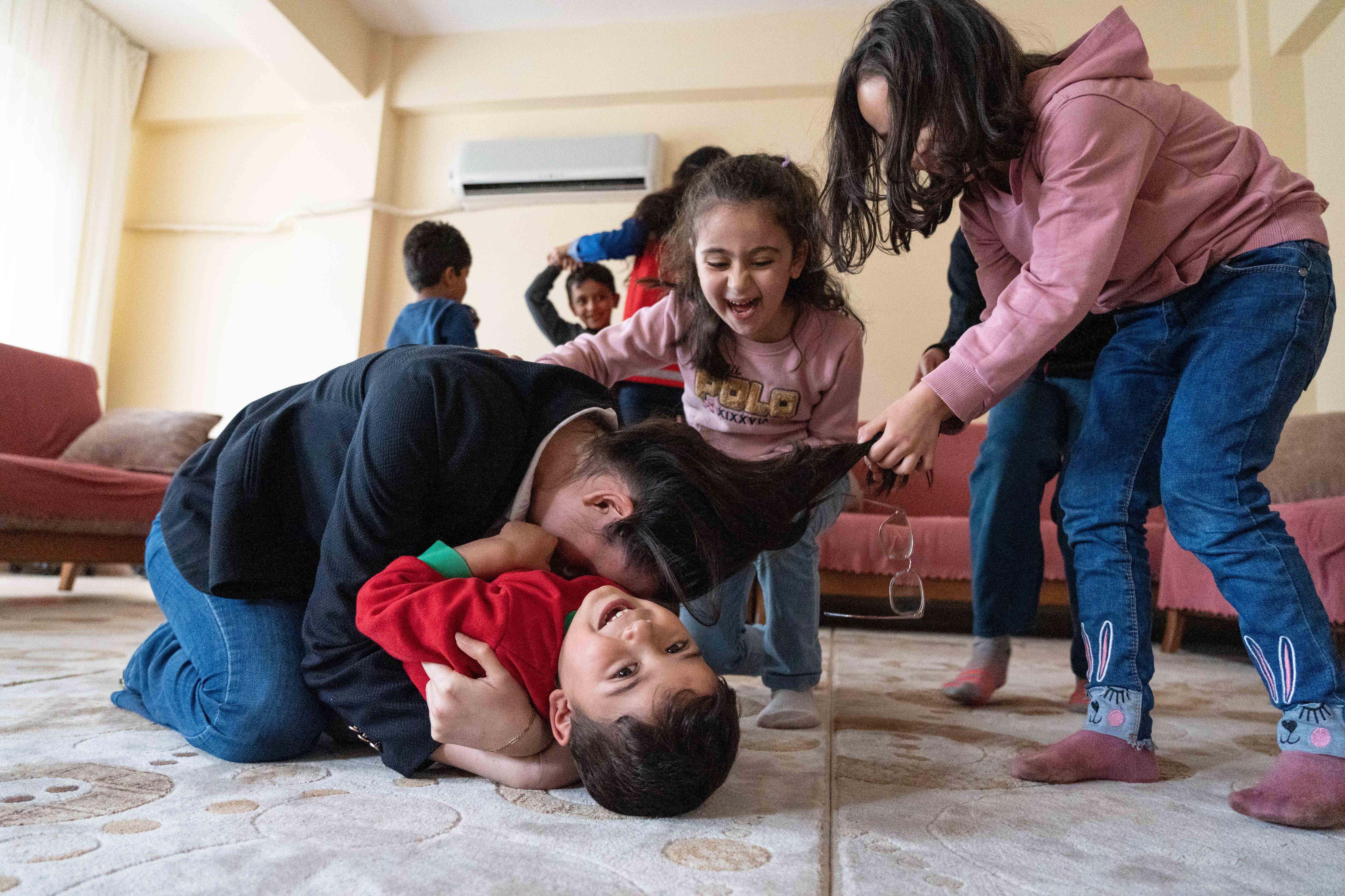 Ms Çapuk rushes to reassure him while juggling another child in her other arm.