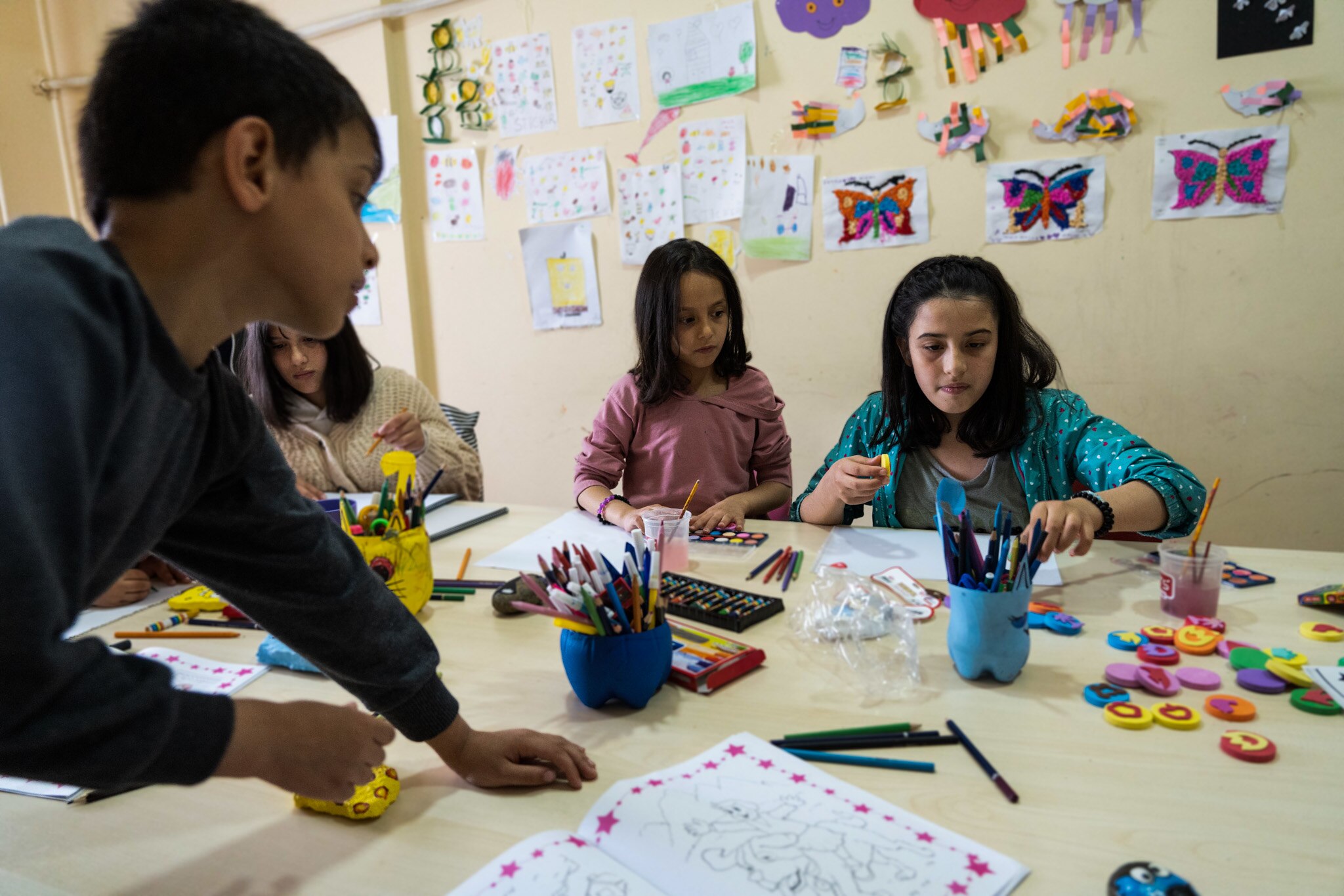 In a small room at the end of a long corridor, a group of seven children sit making colourful artworks under the supervision of two social workers.
