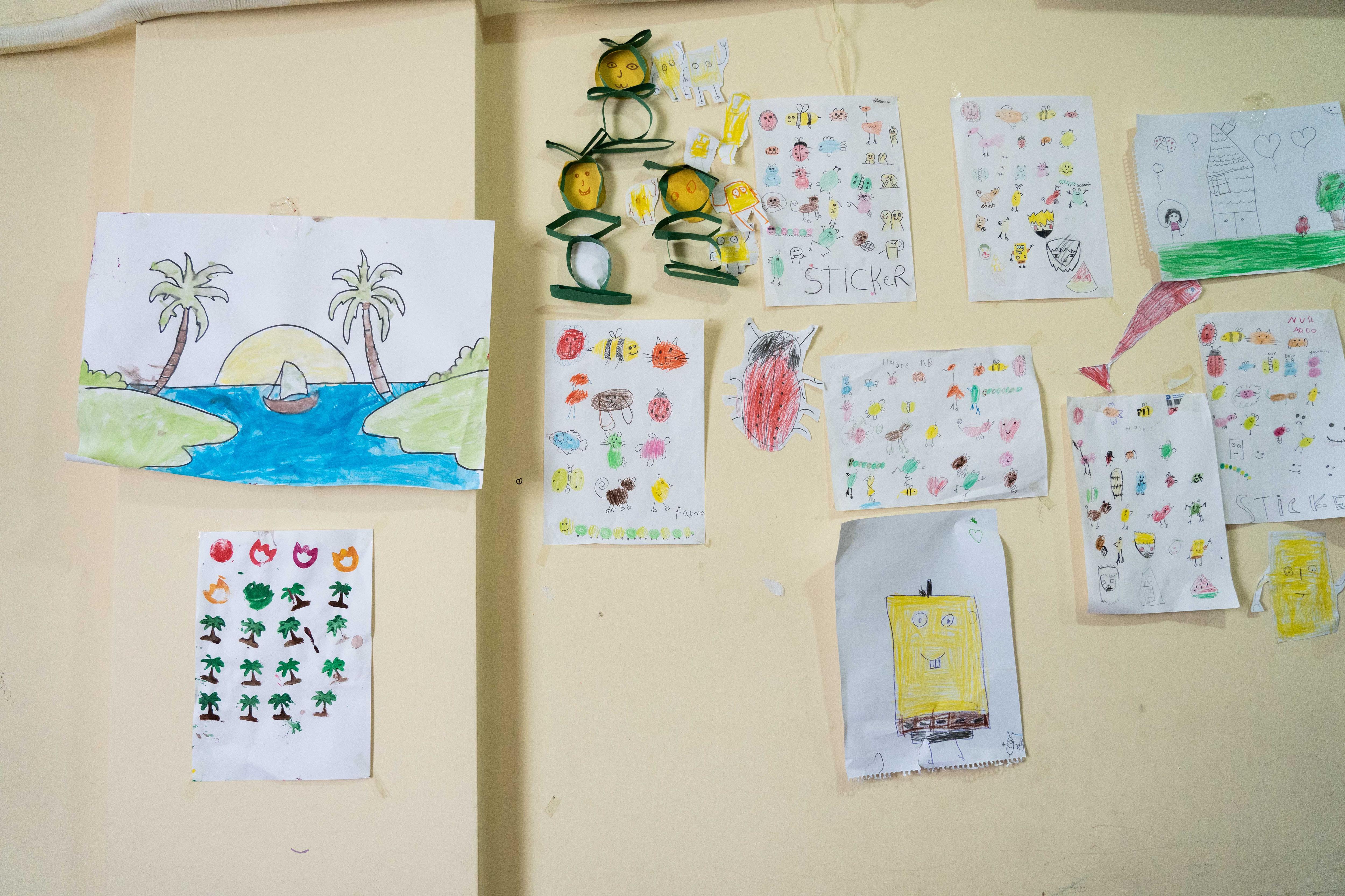 On the walls around them hang some finished works – scrawls of Disney princesses and a scene depicting two swaying palms and a small sailboat drifting towards a setting sun.