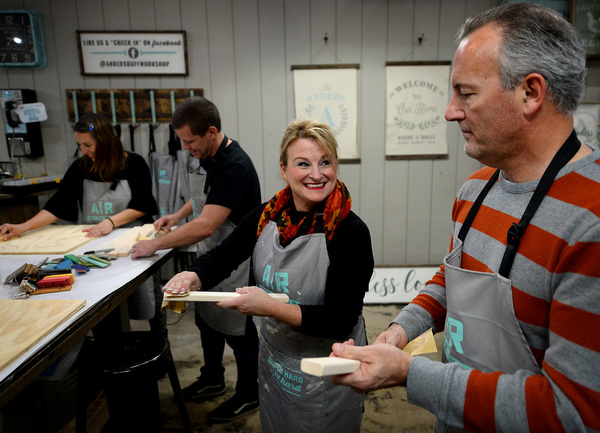 Ladies, many dressed for a night out, snap photos of each other wielding power drills and brushing stain onto wooden planks, and in a little more than an hour, they'll hoist their finished products and take group selfies with their new personalized wooden signs or lazy susans. Most will instantly post on Facebook.