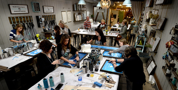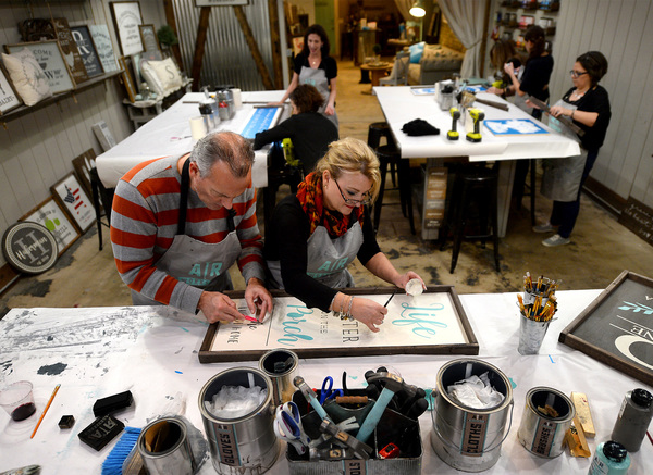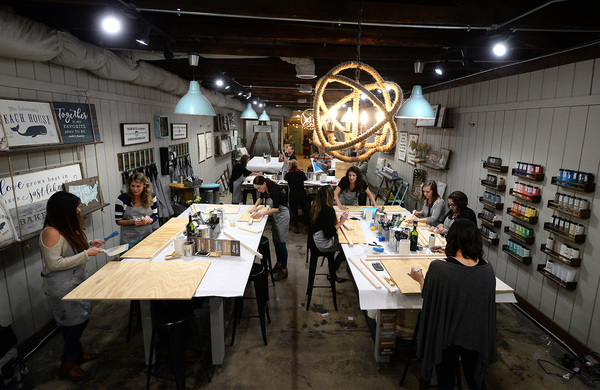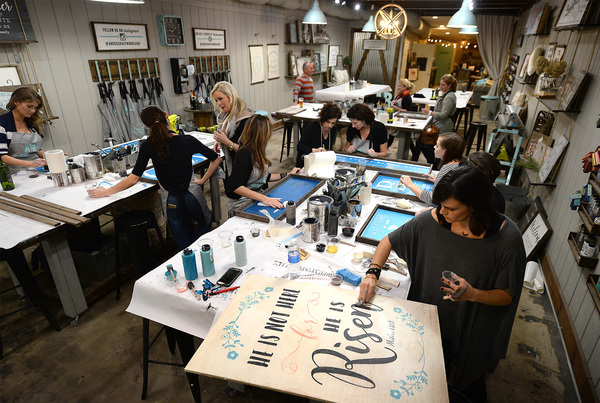 Now, it's a buzzing girls'-night-out spot, as well as a venue for children's birthday parties, church group outings, couples date nights and mom-and-daughter activities. Most planks and lazy susans cost around $65; painted pillows are $40 and there are lettering classes for $65, among other offerings.