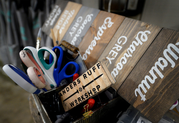 The former billiard hall in downtown Pineville was dark and dingy, but the pair saw potential. They agreed that everything inside would be DIY, from the giant rolling work tables (built by Ruff's husband, Matt) to the handsome wood bar (also built by Matt), the hand-painted metal pendant lights and the wooden sawhorse table that holds big rolls of craft paper.