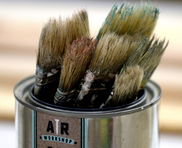 The vibe is farmhouse chic: If it feels like HGTV's Joanna Gaines (from "Fixer Upper" fame) designed it, that's on purpose. Heavy canvas artist dropcloths serve as curtains. Canvas aprons hang on hooks that are upside-down hammers painted the muted teal that is the workshop's signature color.