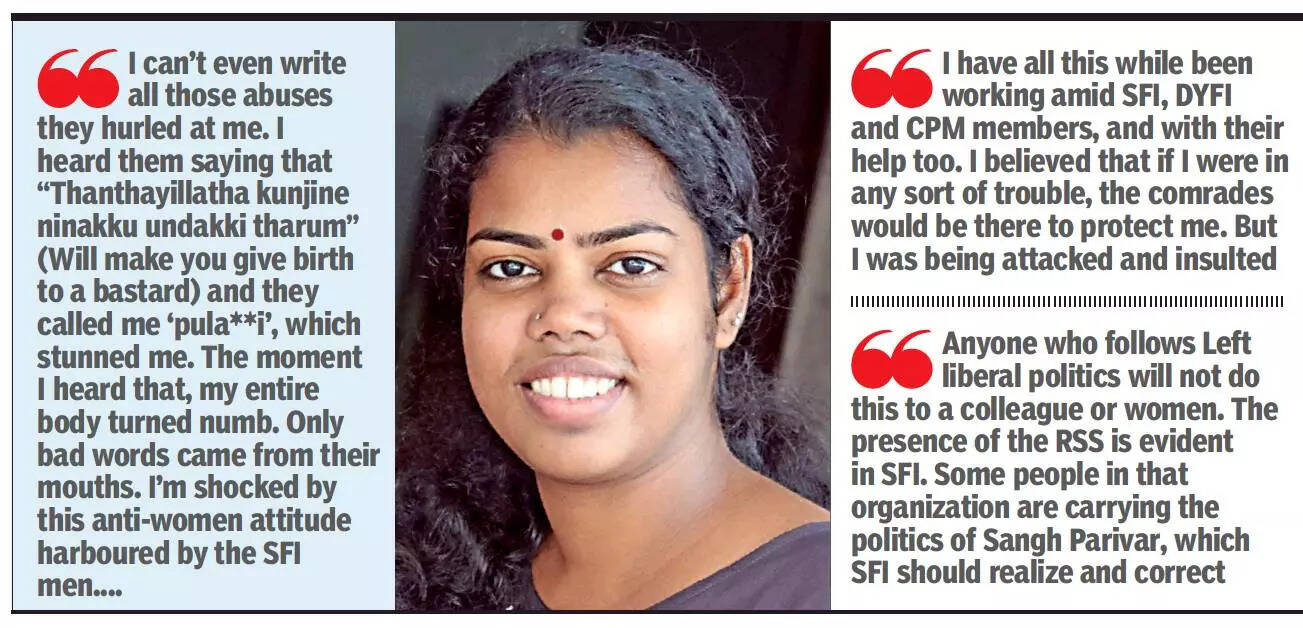 I can’t even write all those abuses they hurled at me. I heard them saying that “Thanthayillatha kunjine ninakku undakki tharum” (Will make you give birth to a bastard) and they called me ‘pula**i’, which stunned me. The moment I heard that, my entire body turned numb. Only bad words came from their mouths. I’m shocked by this anti-women attitude harboured by the SFI men.