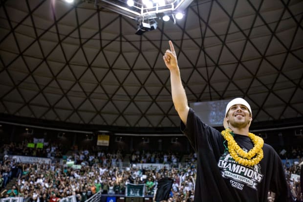 As a junior he set a single-season NCAA record with 58 passing touchdowns, leading pundits to project him as an early-round NFL draft pick. Then he shocked everyone by saying he wasn’t ready to leave Hawaii yet. “I’m so grateful for this place,” he gushed about his adopted home.